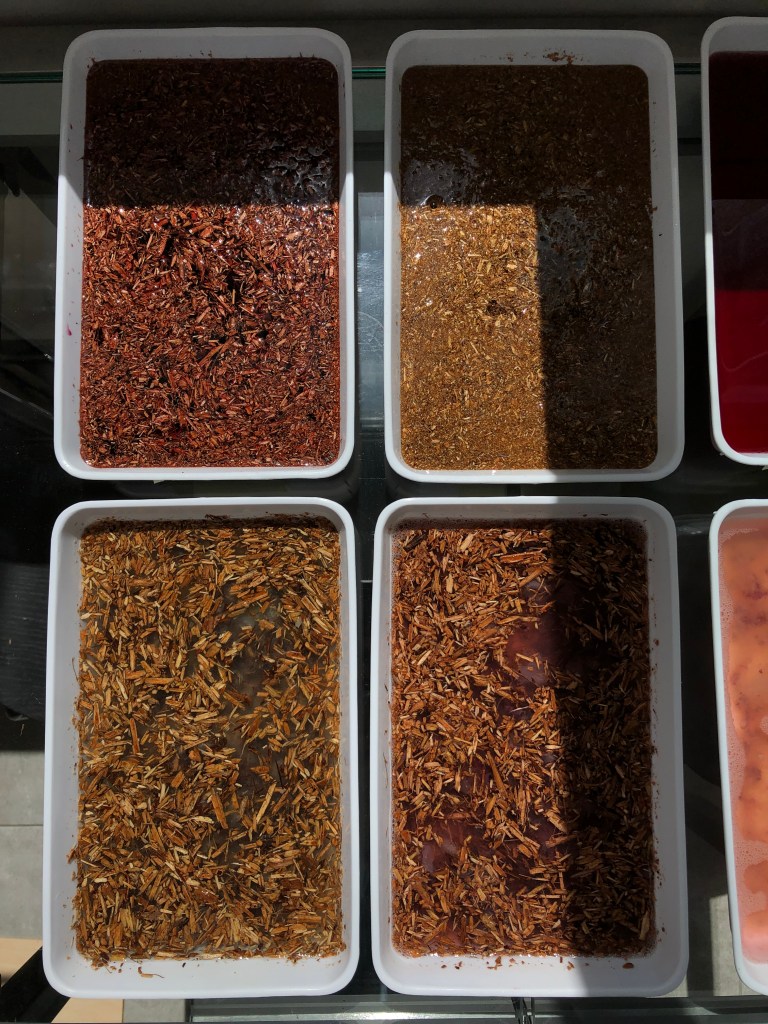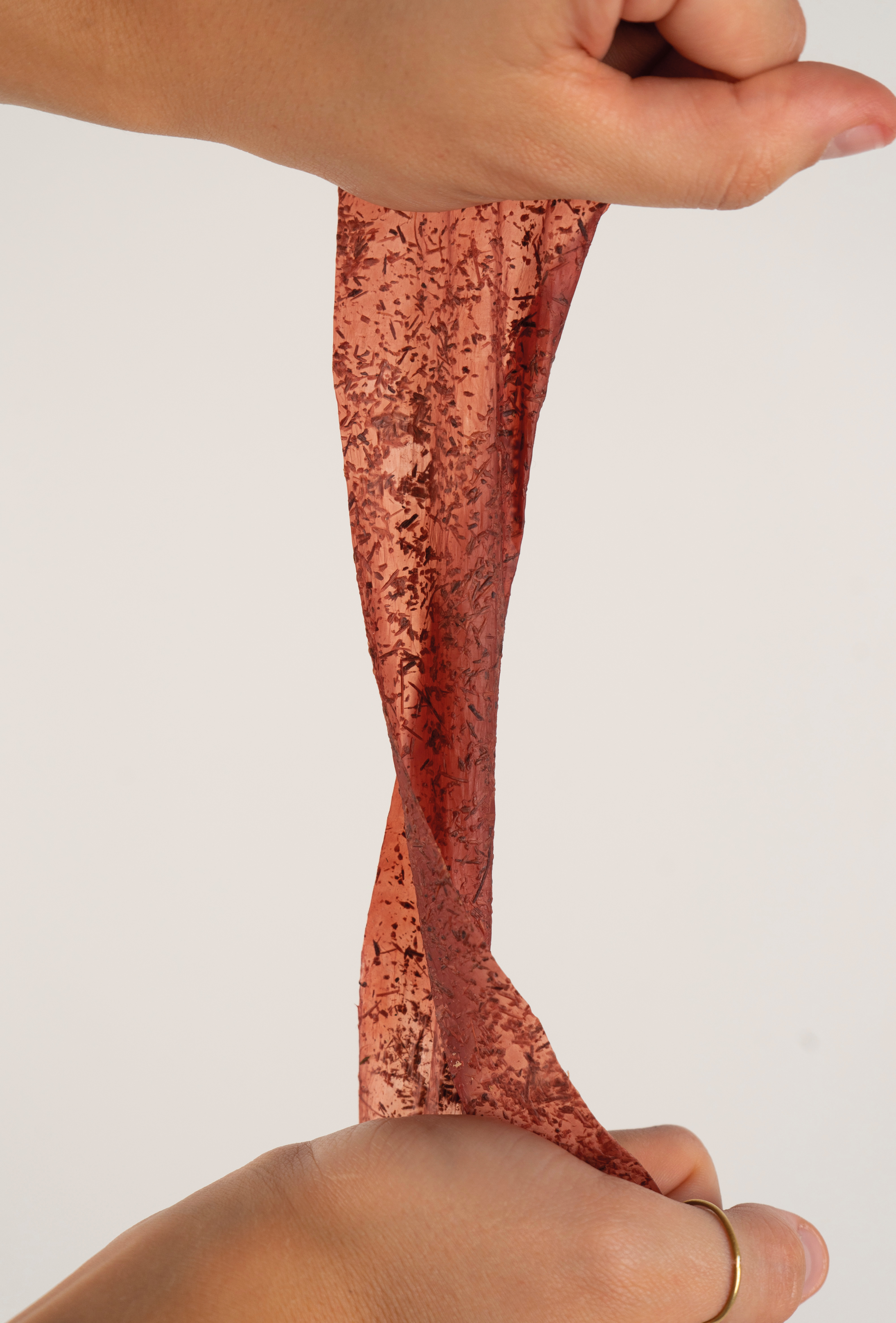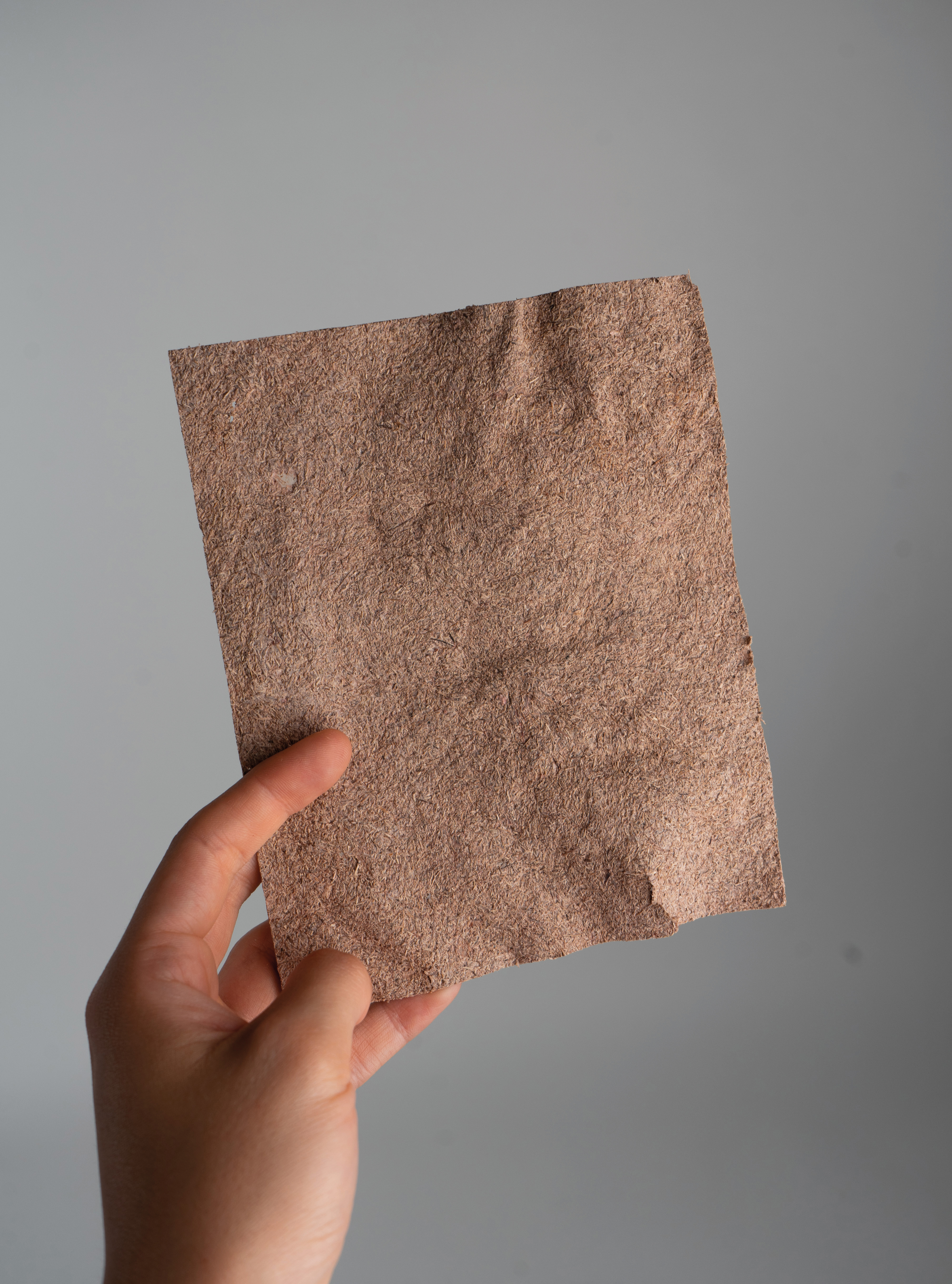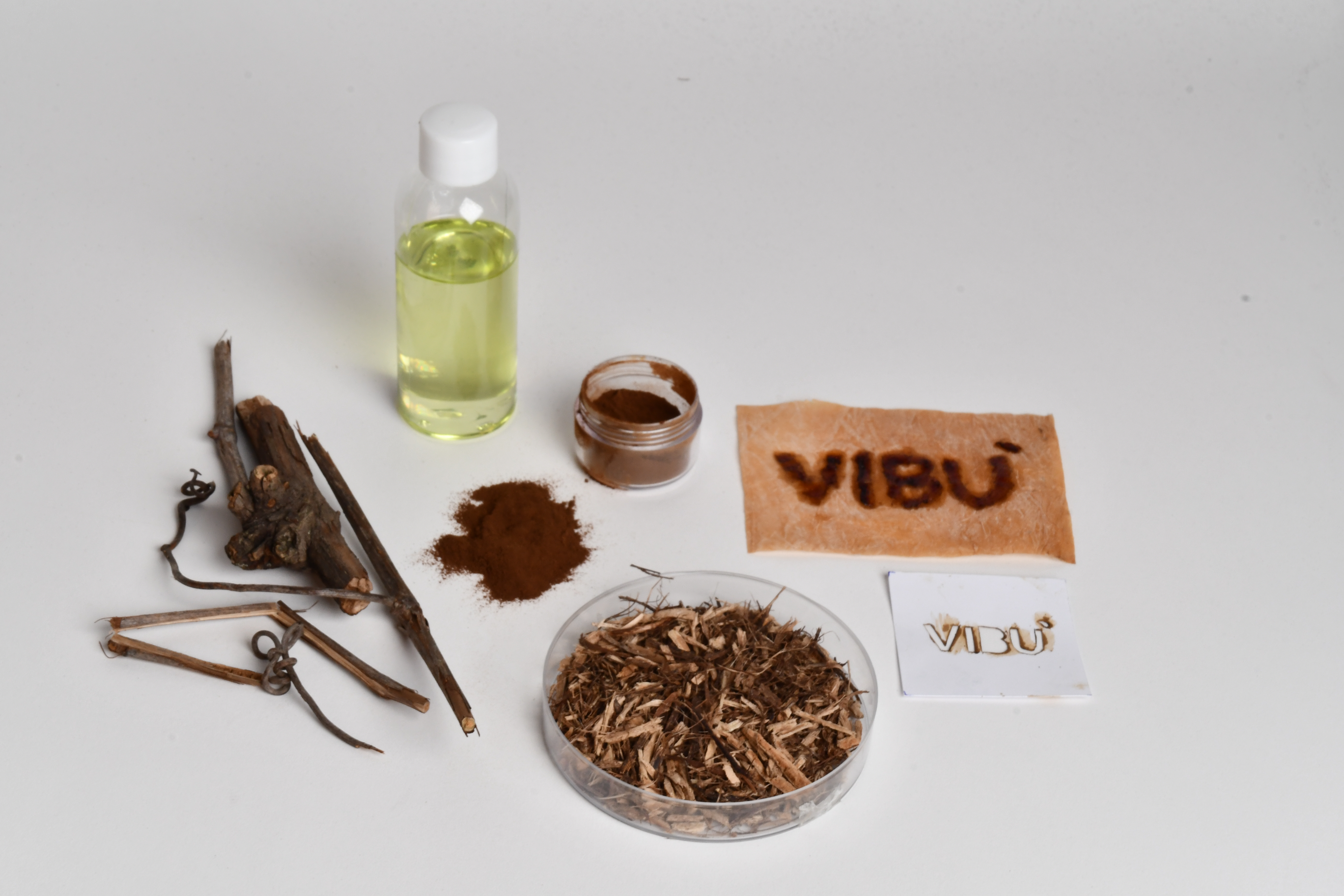 Vibù is a biocomposite material created by fermenting grape marc into bacterial cellulose, then reinforced with fibers extracted from vine shoots and treated with grapeseed oil and a natural dye derived from tannic acid powder. It demonstrates a circular approach to winemaking, transforming waste into valuable resources.