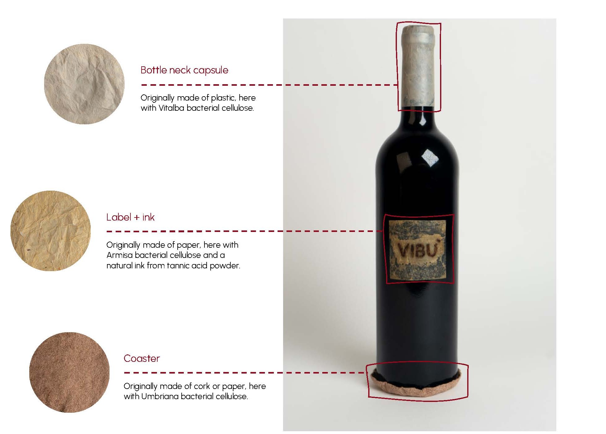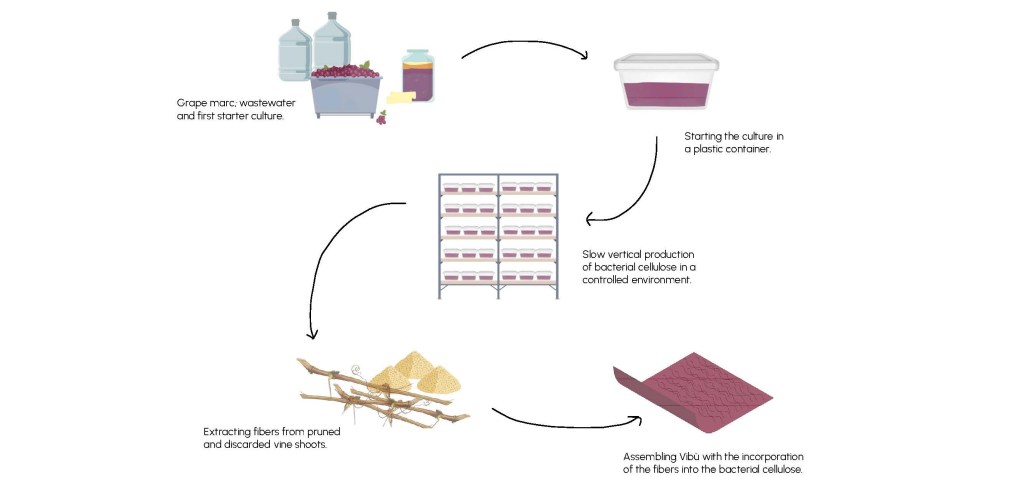 Vibù is an innovative biocomposite material made from waste from the wine industry. It’s created by fermenting grape marc to produce bacterial cellulose, which is then reinforced with fibers from pruned vine shoots, offering a sustainable alternative to traditional materials for applications like bottle capsules and labels. The aim of Vibù is to transform waste into a valuable resource, promoting a circular economy within the wine sector and beyond.